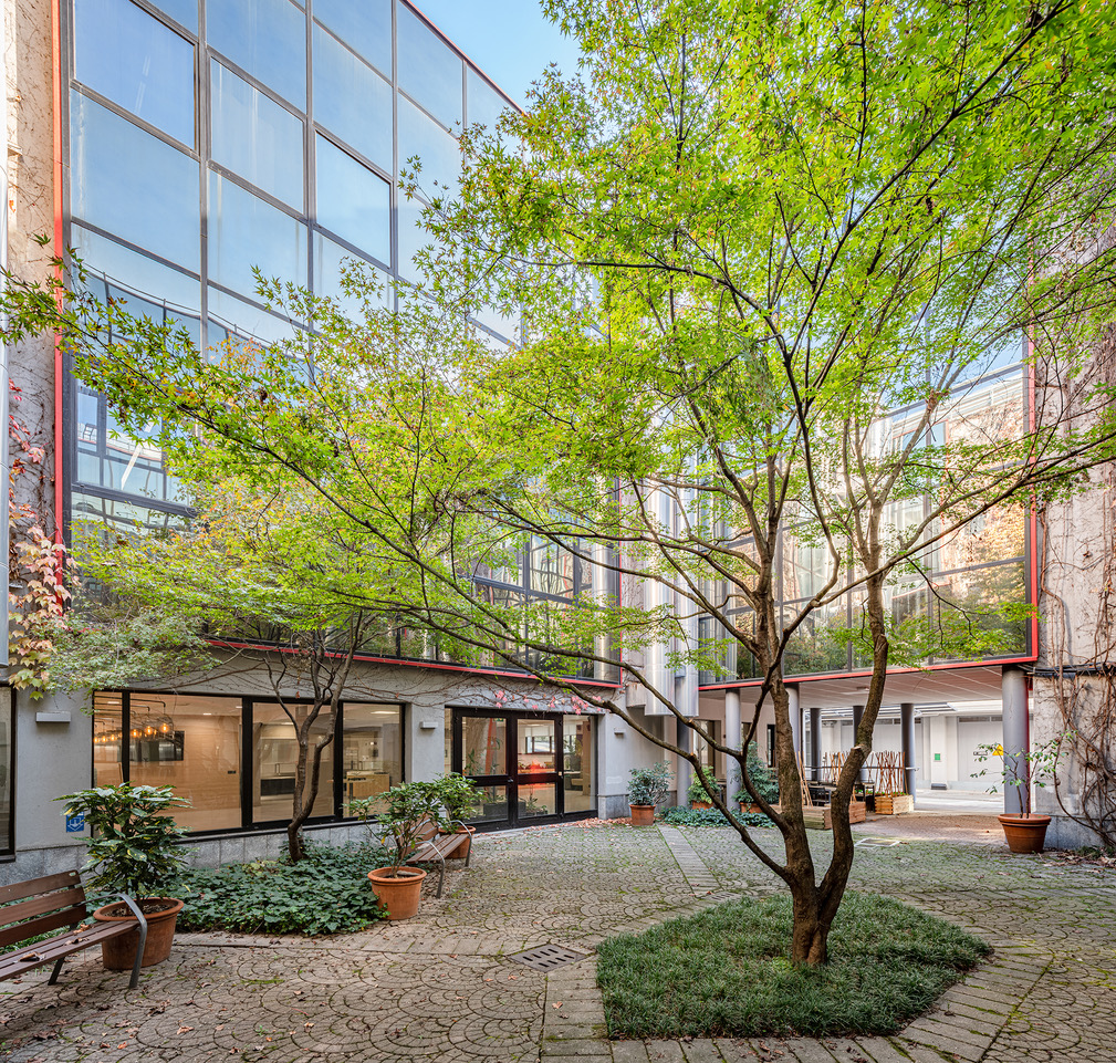 • Aree Relax Esterne: Di fronte alla mensa, si trova un gradevole cortile interno piantumato con essenze di pregio, ideale come area relax all’aperto.